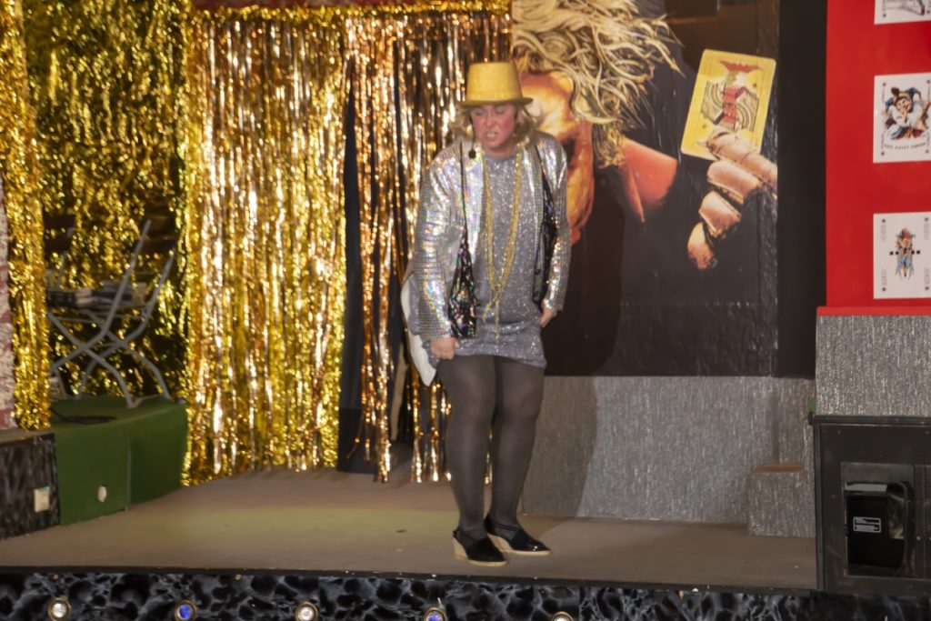 Die Entertainerin Gisa Mühmel im Streß, der Hut ist zu groß, der Glitzerfrack zu eng und die Strumpfhosen…